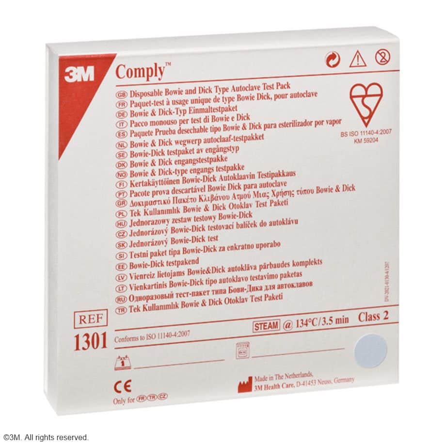 Das Comply™ Bowie-Dick Einmaltestpaket ist ein handliches, einfach zu handhabenes und sehr gut ablesbares Einmaltestpaket für den täglichen Bowie-Dick Test in Vorvakuum-Dampfautoklaven. Es liefert schnelle und sichere Aussagen durch einfache Fehlererkennung. Nach EN-ISO 11140-4:2007. Farbumschlag von blau nach rosa. Nicht reflektierende Oberfläche des Indikatorbogens zur besseren visuellen Beurteilung des Farbumschlags. Klasse 2 Indikator.