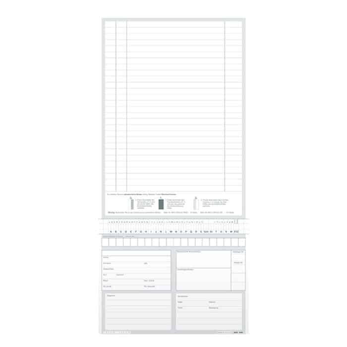 Weiß, 180 g Computerkarton, holzfrei, extra zäh, 4 Quernutungen, 1 x oben, 3 x unten, plan verpackt. Standard-Adressfeld, Klebefeld für Abheftstreifen (Artikel-Nr. 60.010), Linierung 8,5 mm. Wird zur Anwendung 2x gefaltet. Maße aufgeklappt 442 x 210 mm, gefaltet bis 164 x 210 mm.