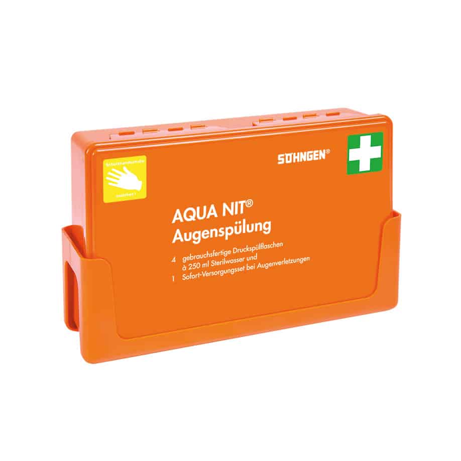 Kann an allen unfallgefährdeten Stellen und Arbeitsplätzen bereitgehalten werden. Hat durch die Wandhalterung immer einen festen Platz, kann mit einem Griff schnell und mühelos aus der Halterung entnommen und an den Unfallort gebracht werden. Es ist im Notfall immer reichlich Augenspülflüssigkeit vor Ort verfügbar, nicht benötigte Augenspülflaschen bleiben unversehrt. Inhalt: 4 gebrauchsfertige Druckspülflaschen, Sofortset für Augenverletzungen mit DuOcul-Augenkompressen, Augenklappe, SÖHNGEN® Silk Pflasterstreifen, DERMOTEKT® Kompresse und Einmal-Schutzhandschuhen. Kunststoffbox ca. 260 x 160 x 80 mm, orange, inkl.Wandhalterung.