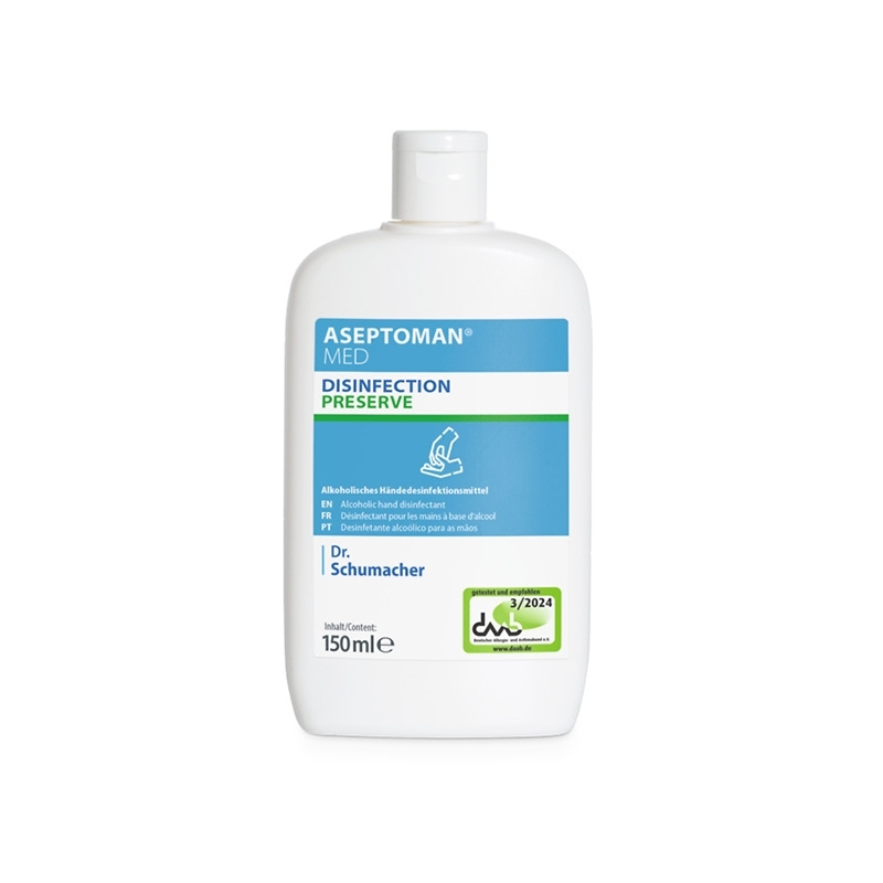 Alkoholisches Händedesinfektionsmittel zum Einreiben in die Haut. ASEPTOMAN® MED ist durch seinen niedrigen Alkoholgehalt besonders hautverträglich und hat dennoch ein breites Wirkspektum, daher ist es das ideale Produkt für die tägliche Routine.