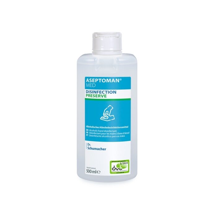 Alkoholisches Händedesinfektionsmittel zum Einreiben in die Haut. ASEPTOMAN® MED ist durch seinen niedrigen Alkoholgehalt besonders hautverträglich und hat dennoch ein breites Wirkspektum, daher ist es das ideale Produkt für die tägliche Routine.