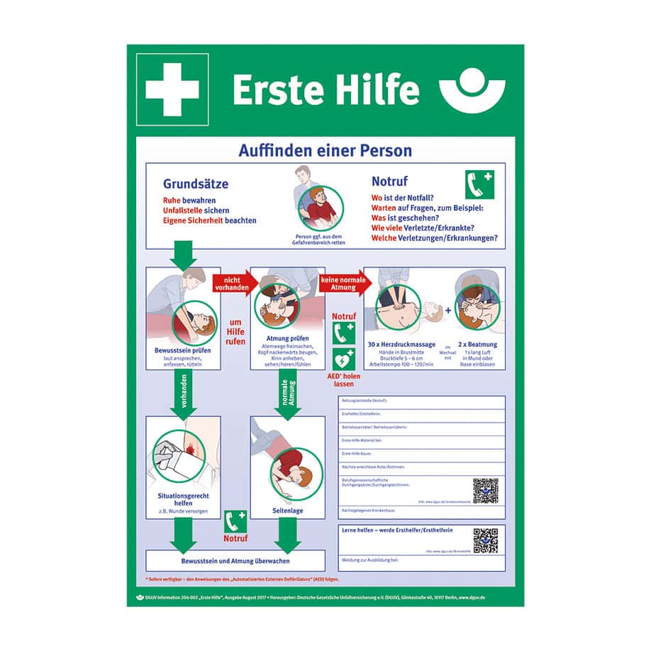 Plakat DIN A2 mit den wichtigsten Verhaltensweisen bei Unfällen. DGUV Information 204-002.