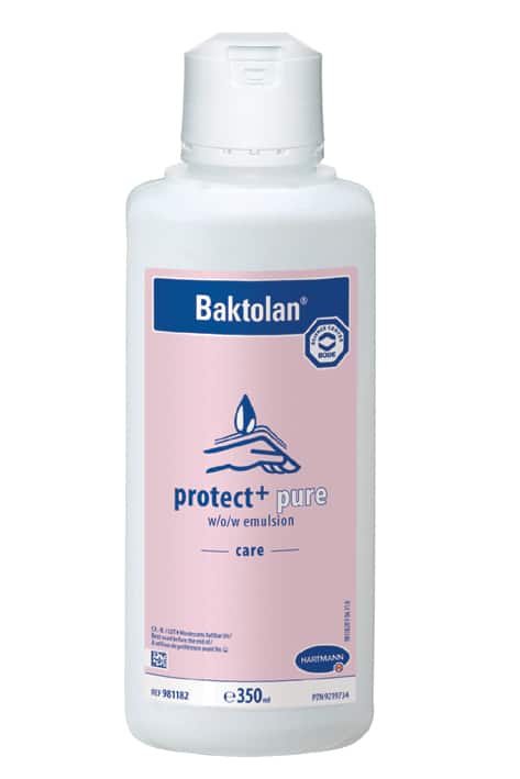 Lotion zum Schutz vor wässrigen Lösungen und regenerierende Pflege für rissige und stark beanspruchte Haut. Baktolan® protect+ pure findet Anwendung in allen Bereichen des Gesundheitswesens, der Industrie und Lebensmittelverarbeitung in denen prophylaktischer Hautschutz vor wässrigen Lösungen erforderlich ist. Auch für Bereiche geeignet wo stark beanspruchte oder auch rissige Haut regeneriert und die Hautbarriere wieder gestärkt werden soll und kann unter Handschuhen angewendet werden, um Hautirritationen, die durch die okklusiven Bedingungen entstehen können, entgegenzuwirken.
