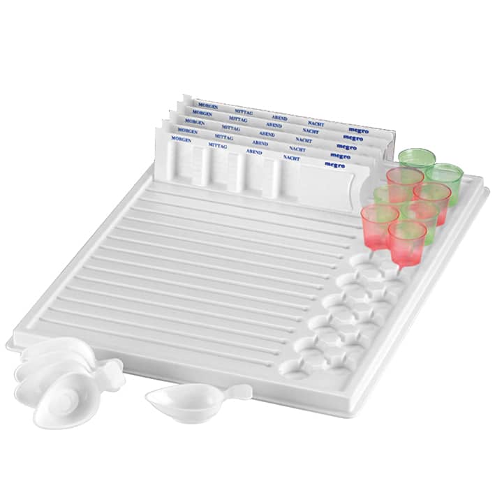 Maße (L x B x H): 440 x 340 x 15 mm, für 19 Einnehmebecher und 19 Dispenser, weiß, aus Polystyrol