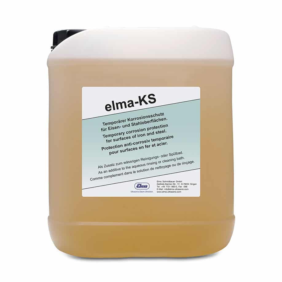 Flüssig, mild alkalisch, Korrosionsschutzzusatz. elma-KS eignet sich als Korrosionsschutzmittel für korrosionsempfindliche metallische Werkstoffe wie z.B. Stahl, Grauguß und Hartmetalle. Diese Werkstoffe werden mit einem molekularen Schutz überzogen, der temporär vor Korrosion schützt. Nachfolgende Beschichtungs- (PVD, CVD) oder Härteprozesse (Plasma- und Carbonitrieren) werden bei bestimmungsgemäßer Anwendung nicht beeinträchtigt.