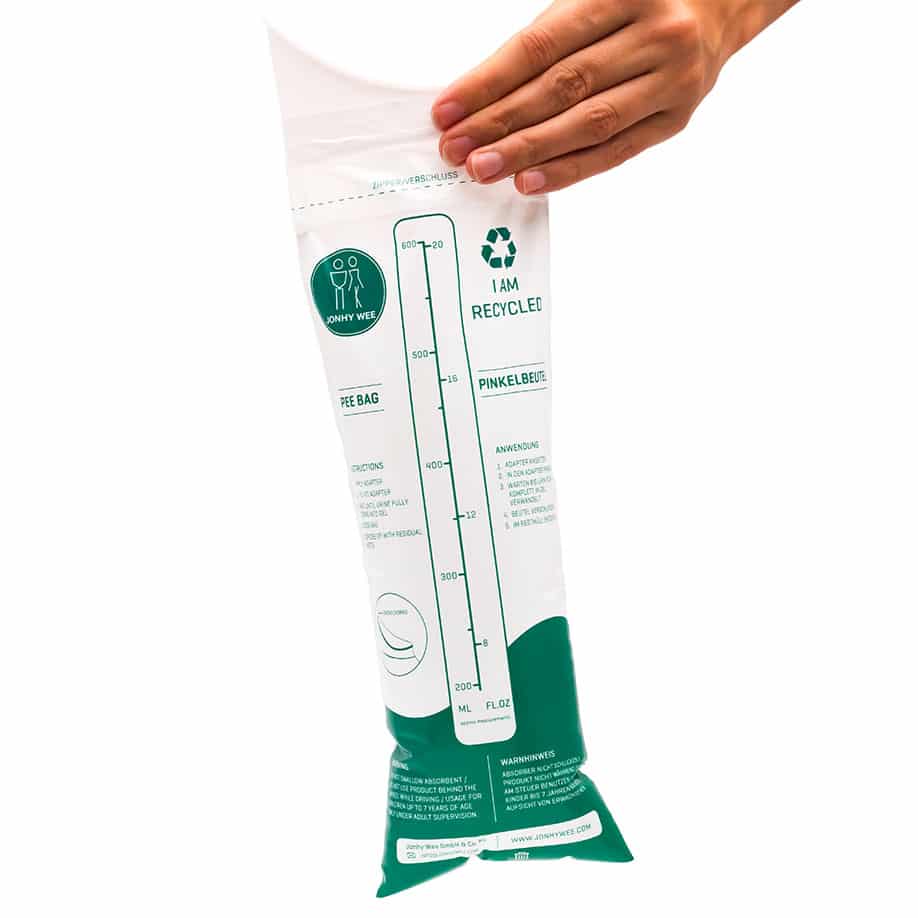 Geeignet für Kinder, Frauen und Männer. Die Polymerkristalle verwandeln den Urin beim Eintritt in den gewebten Beutel sofort in Gel. Es beugt der Ausbreitung von Bakterien vor und unterdrückt den Uringeruch. Dieses Gel ist im gewebten Beutel eingeschlossen. Das Fassungsvermögen beträgt max. 600 ml. Der Beutel ist bis zur angegebenen Füllmenge mehrfach nutzbar. Nach dem Gebrauch kann Jonhy Wee schnell und unkompliziert im Müll entsorgt werden. Jonhy Wee wird bereits in vielen Krankenhäusern als effektive und effiziente Alternative zur herkömmlichen Bettpfannen oder Flaschen genutzt. Jonhy Wee ist mobil einsetzbar und passt z.B. in Erste-Hilfe Kästen, Autos, Campingzubehör, Flugzeuge und andere Transportmittel. Uneingeschränkt verwendbar, da kein Verfallsdatum. Aus recycelten Materialien.