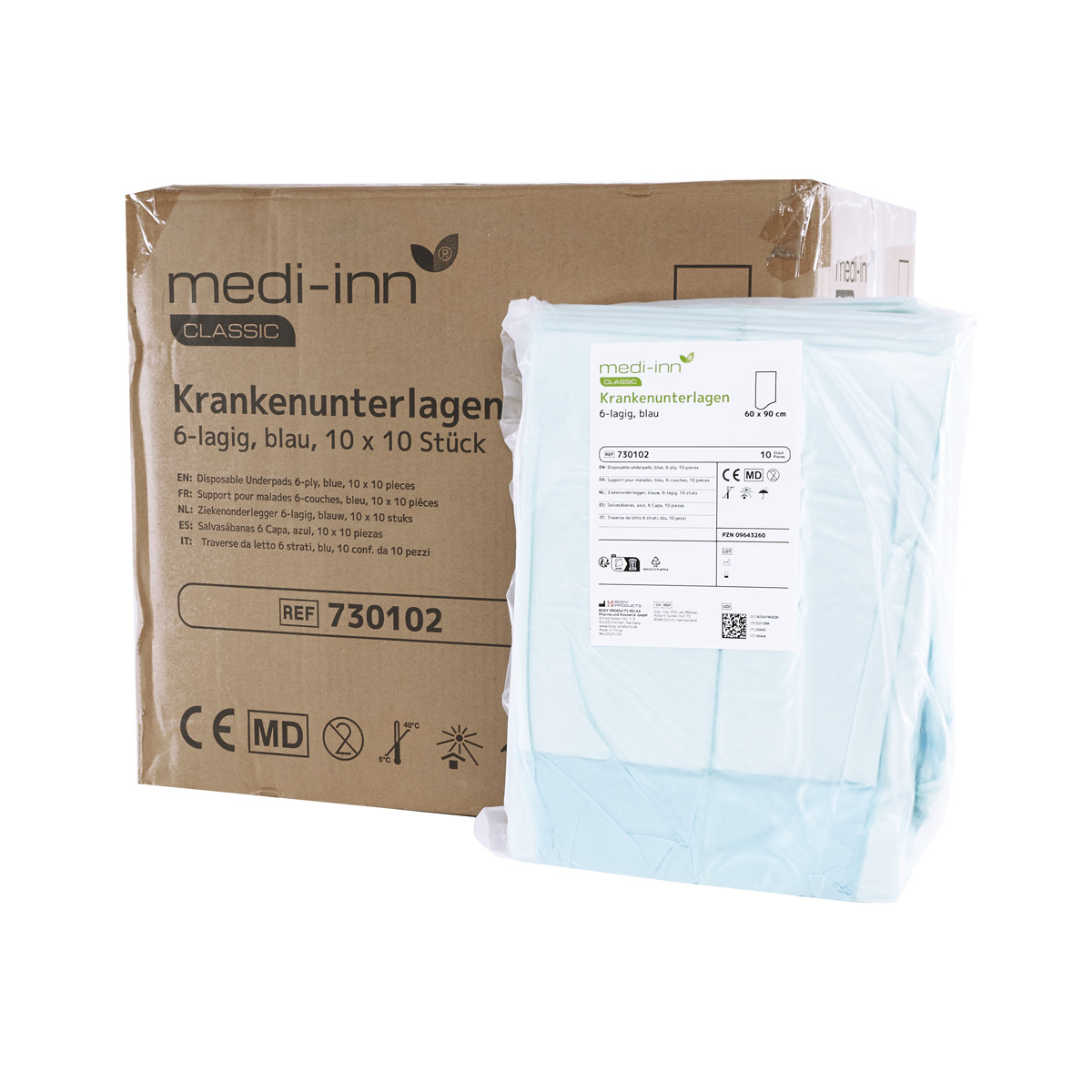 Die rundum geschlossenen Einmal-Krankenunterlagen von Medi-Inn eignen sich bestens für die Kranken- und Altenpflege. Sie können mit ihrem saugstarken Kern aus hautsympathischem Vlies und weißem Recycling-Tissue bestens als Einweg-Bettschutz genutzt werden und unterbinden unangenehme Gerüche. Die rutschhemmende und geschlossene PE-Folie sorgt zudem für einen sicheren Halt im Bett.