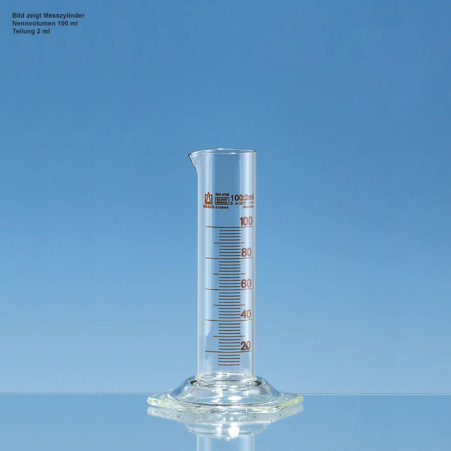 DIN EN ISO 4788. Justiert auf „In“. Mit Ausguss und Sechskantfuß. Fehlergrenze 1 ml, Höhe 145 mm.