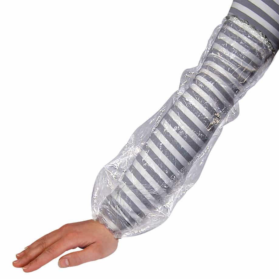 zur Abdeckung der Unterarme, geeignet für den Hygienebereich, glatte Polyäthylenfolie, an den Enden eingefasste Gummibänder für sicheren Halt.