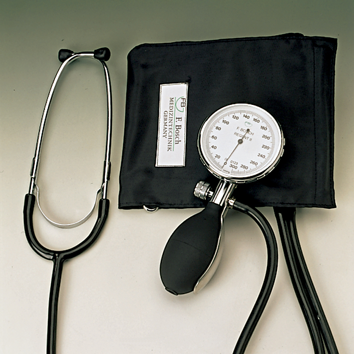 robustes Blutdruckmessgerät zur Selbstmessung mit integriertem Stethoskop, mit schwarzer Ziehklettenmanschette zum einfachen Anlegen am Oberarm, mit großer, gut und einfach ablesbarer Skala, im Etui