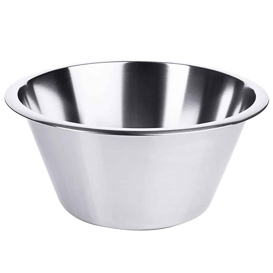 tiefe konische Form, aus Edelstahl 18/10, seidenmatt poliert, offener, glatter Rand, mittelschwere Qualität, Ø-Boden 18 cm, Ø-Innen 26,5 cm