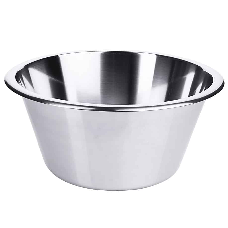 tiefe konische Form, aus Edelstahl 18/10, seidenmatt poliert, offener, glatter Rand, mittelschwere Qualität, Ø-Boden 19,5 cm, Ø-Innen 28,5 cm