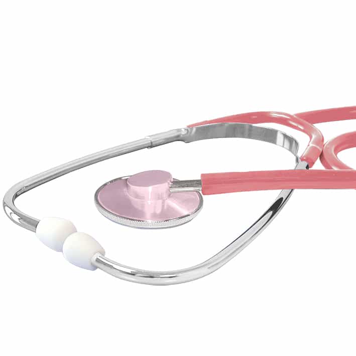 ausgezeichnete Akustik durch ultraleichtes Aluminium-Bruststück, außen liegende Ohrbügelfeder, mit weißen, harten Schraub-Ohroliven, 100% latexfrei und nickelfrei, Flachmembrane: 43 mm Ø, Gesamtlänge: 80 cm, Gewicht: ca. 77 g