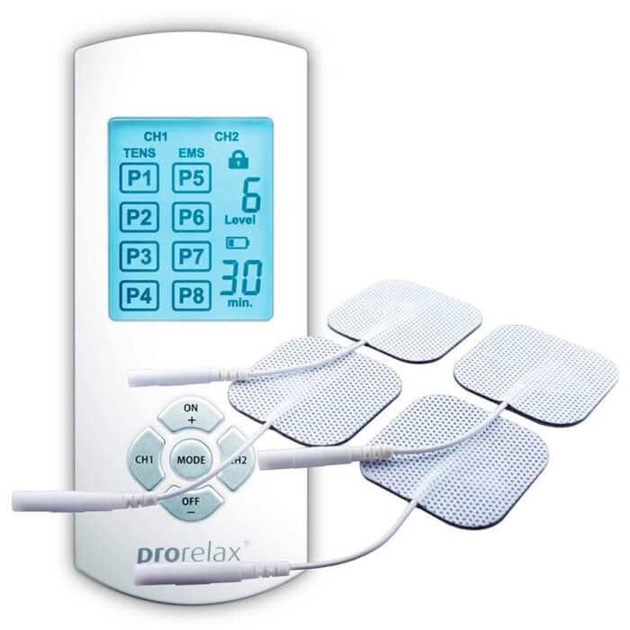 Das Gerät prorelax® Duo Comfort hat 8 voreingestellte Programme zur Auswahl, 2 Kanäle, die in der Intensität separat regelbar sind, 12 Stufen-Timer, und wird mit 4 selbstklebenden Elektroden-Pads geliefert. Mit der TENS-Funktion lassen sich gezielt Schmerzen behandeln. Durch die elektrischen Reizströme werden die Durchblutung gefördert und die Produktion von Endorphinen angeregt – ob Rücken, Knie, Nacken, Schulter usw. Der elektrische Muskelstimulator spricht ganz gezielt einzelne Muskeln an, die z.B. wieder aufgebaut oder zusätzlich gestärkt werden sollen. Das Kombi-Gerät eignet sich hervorragend zur Schmerzlinderung und ebenfalls als Massagegerät zur Lockerung hartnäckiger Verspannungen.