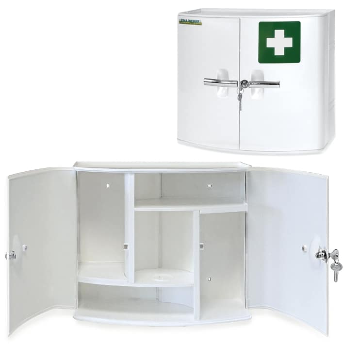 2-türiger Verbandschrank aus Kunststoff mit Magnetverschluss, geräumige Innenaufteilung, abschließbar, 2 Schlüssel, inkl. Montagematerial